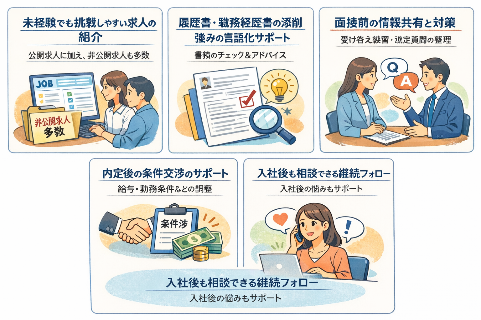 さらに、応募から面接までの段取りや、企業ごとの見られ方(どこを評価するのか)を踏まえて準備できるため、「がんばっているのに結果が出ない」を減らせます。未経験者は情報不足で遠回りしがちなので、第三者の視点が入るだけでも改善の速度が変わります。