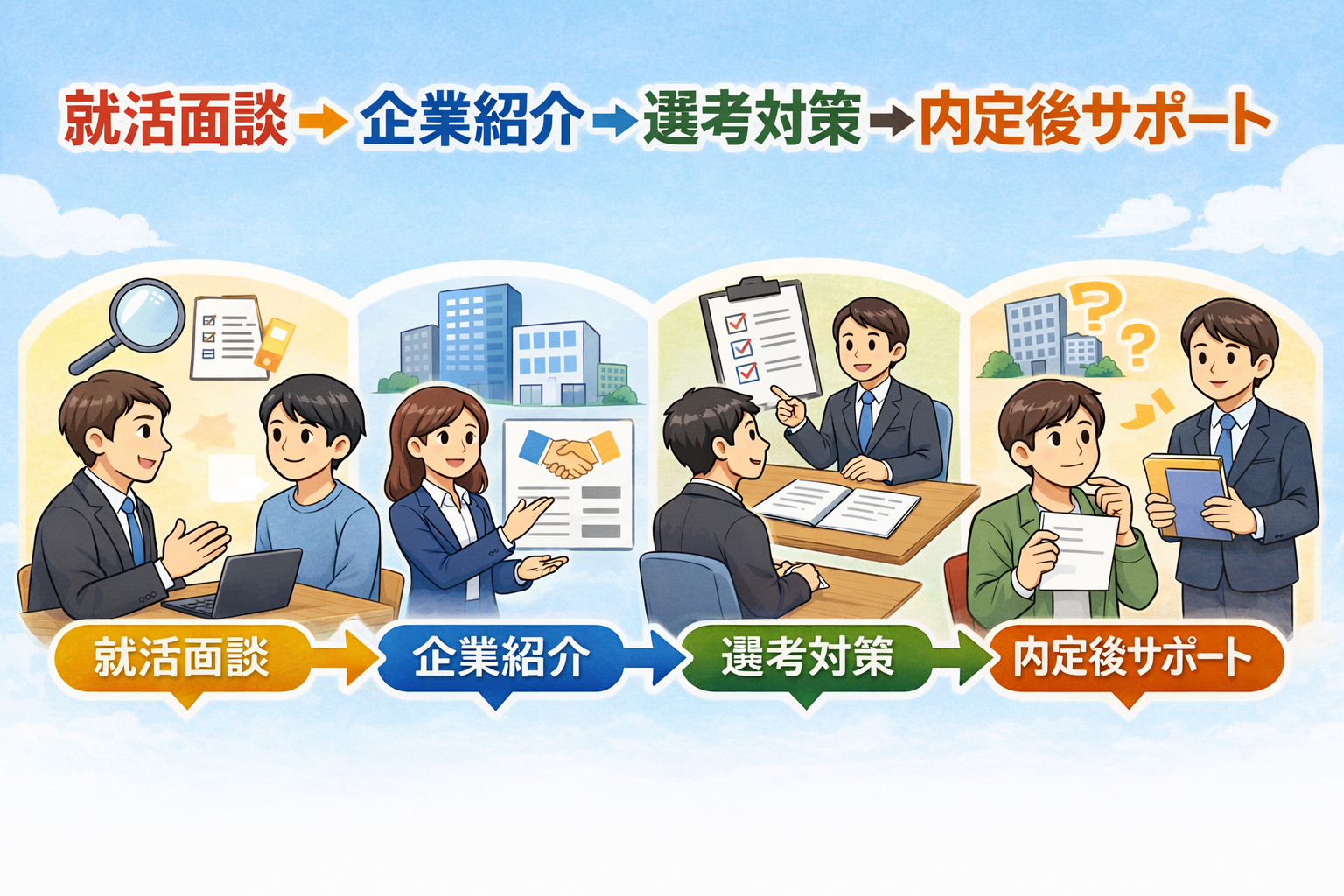 専任アドバイザーが、自己分析から企業選び、応募書類、面接対策、内定後の意思決定までを一貫してサポートします。