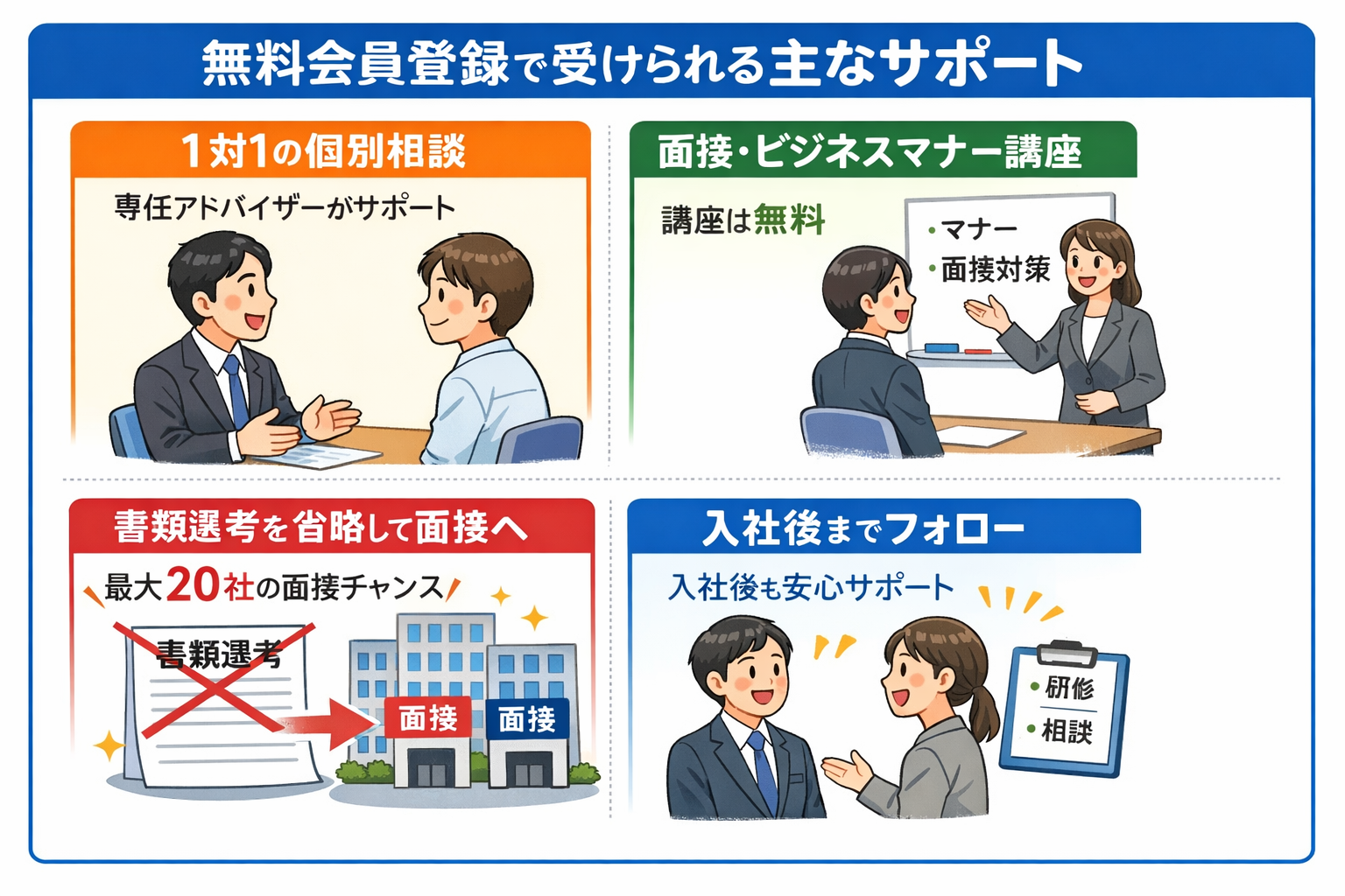 無料会員登録から始められる就職支援なら、相談〜準備〜企業との出会い〜入社後フォロー