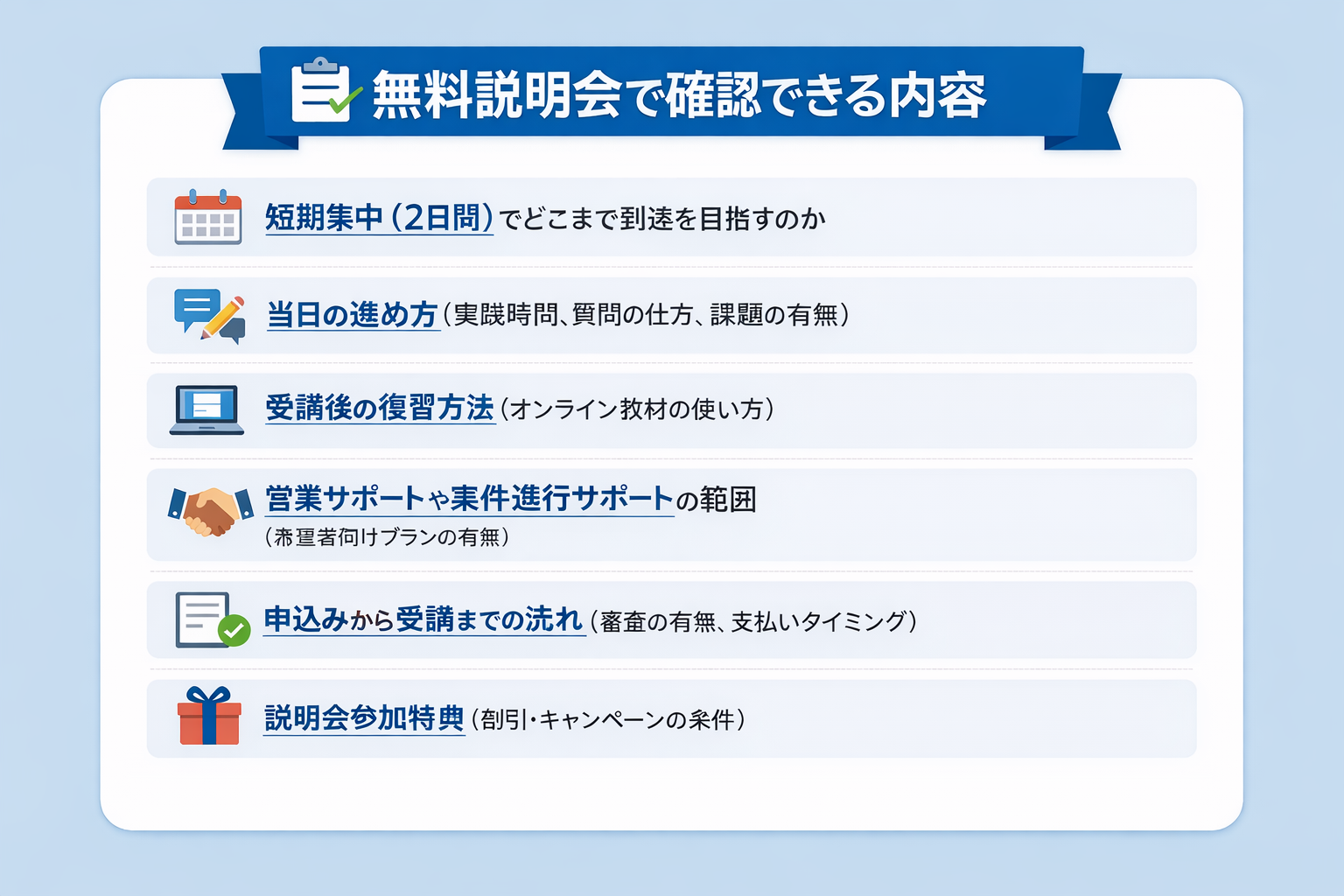 学習内容・受講の流れ・必要な準備・サポート体制・費用感を先に把握できるため、受講後のギャップを減らし、自分に合う学び方か判断できます。