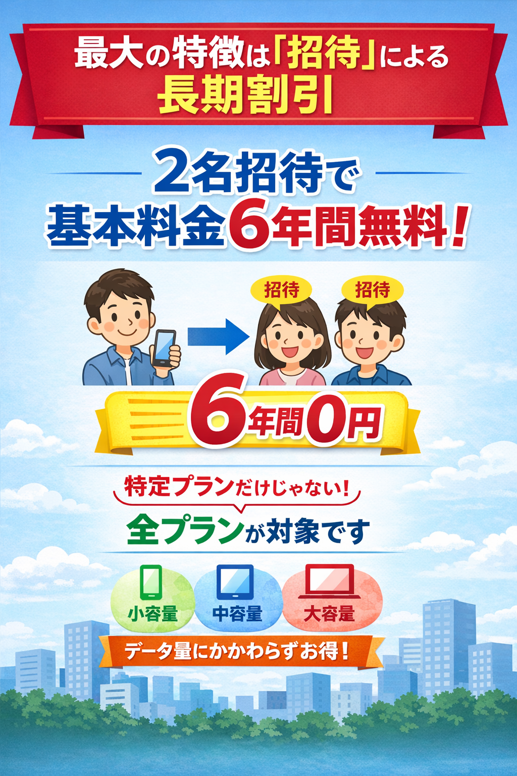 この通信サービスは、2名招待で基本料金6年間無料という長期メリットに加え、