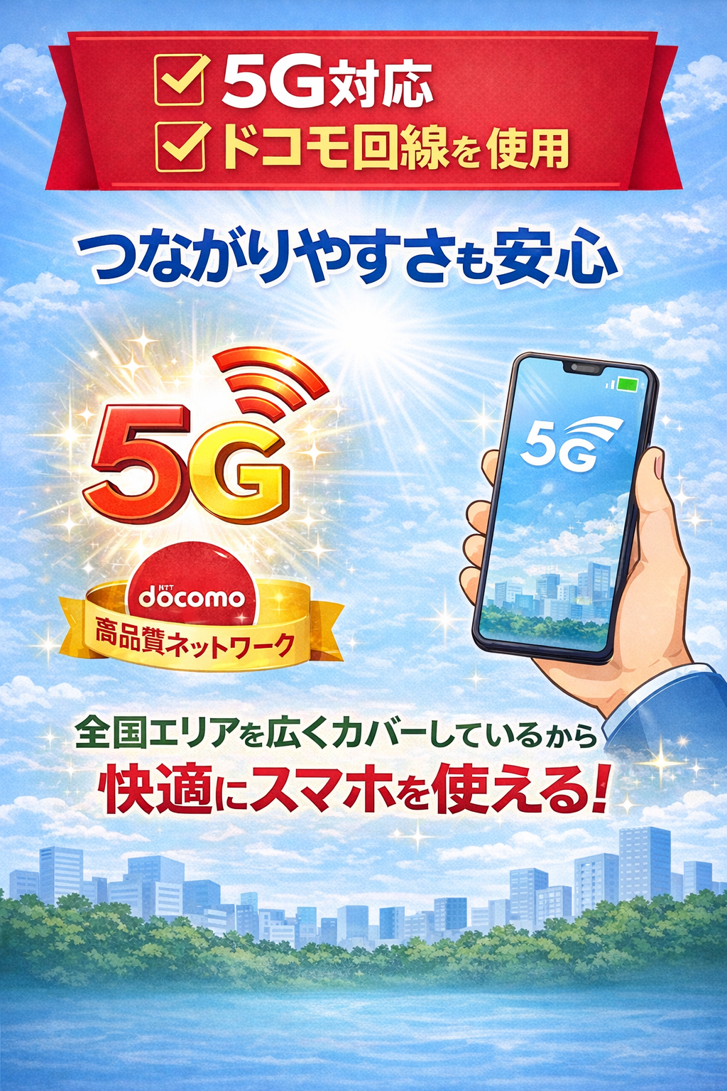 このサービスは5Gに対応し、ドコモ回線を利用しているため、価格だけでなく普段使いのしやすさも重視したい方に向いています。