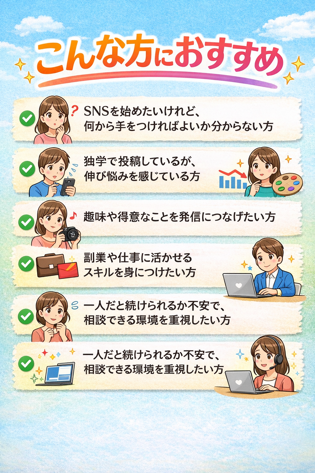 SNSを仕事や副業、日々の発信に活かしたいと思っていても、「何から始めればよいのか分からない」「独学では限界を感じる」「自分に合った学び方を知りたい」と悩む方は少なくありません。
