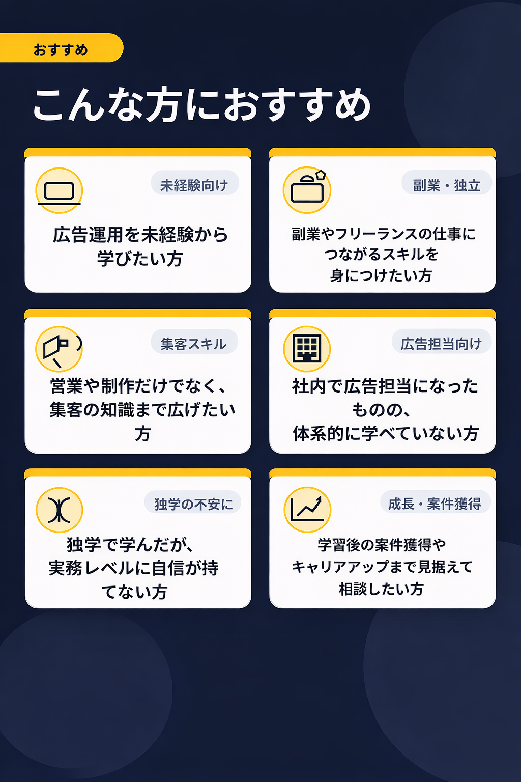 また、案件獲得や継続運用を見据えたサポートがある点も見逃せません。広告運用のスキルは、学んだあとにどう活かすかが重要です。副業として始めたい方、将来的に独立したい方、社内の広告運用を任されている方にとって、学習後の動き方まで相談できる環境は心強いポイントです。