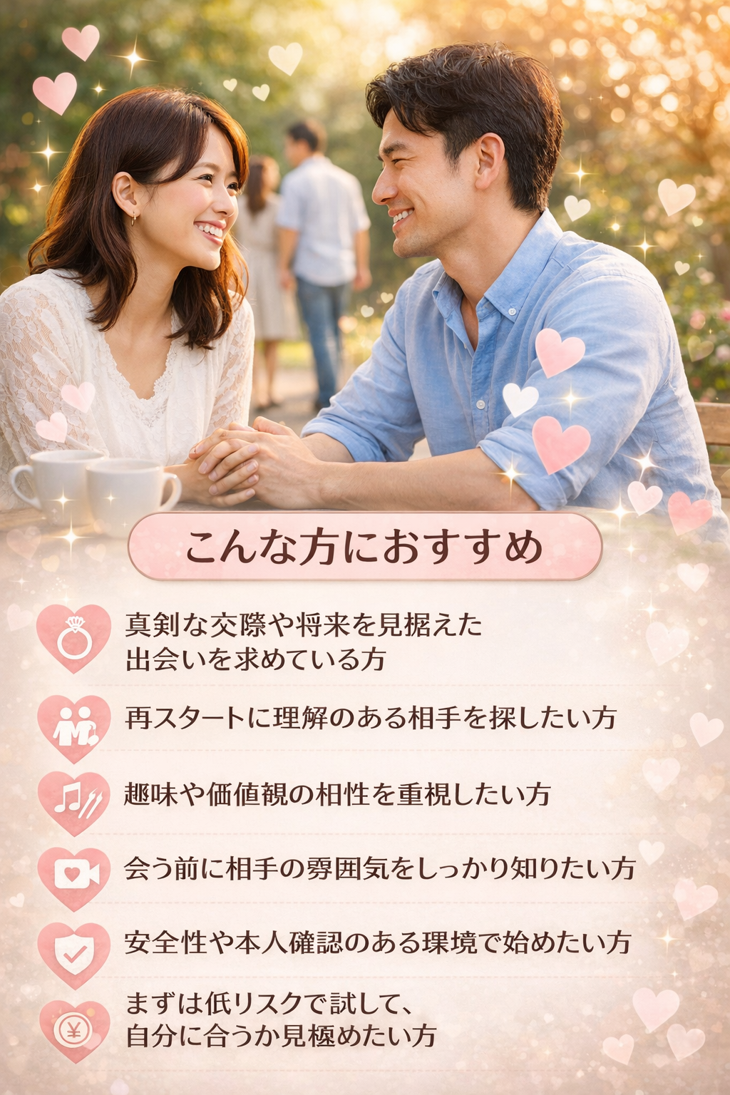 将来を見据えた出会いを探したいと思っていても、「どのサービスを選べばよいかわからない」「遊び目的の利用者が多い場所は避けたい」「できるだけ安心して始めたい」と感じる方は少なくありません。そんな方に注目されているのが、恋人探しだけでなく、結婚を意識した出会いや再スタートを視野に入れた出会いまで幅広く応援するマッチングサービスです。
